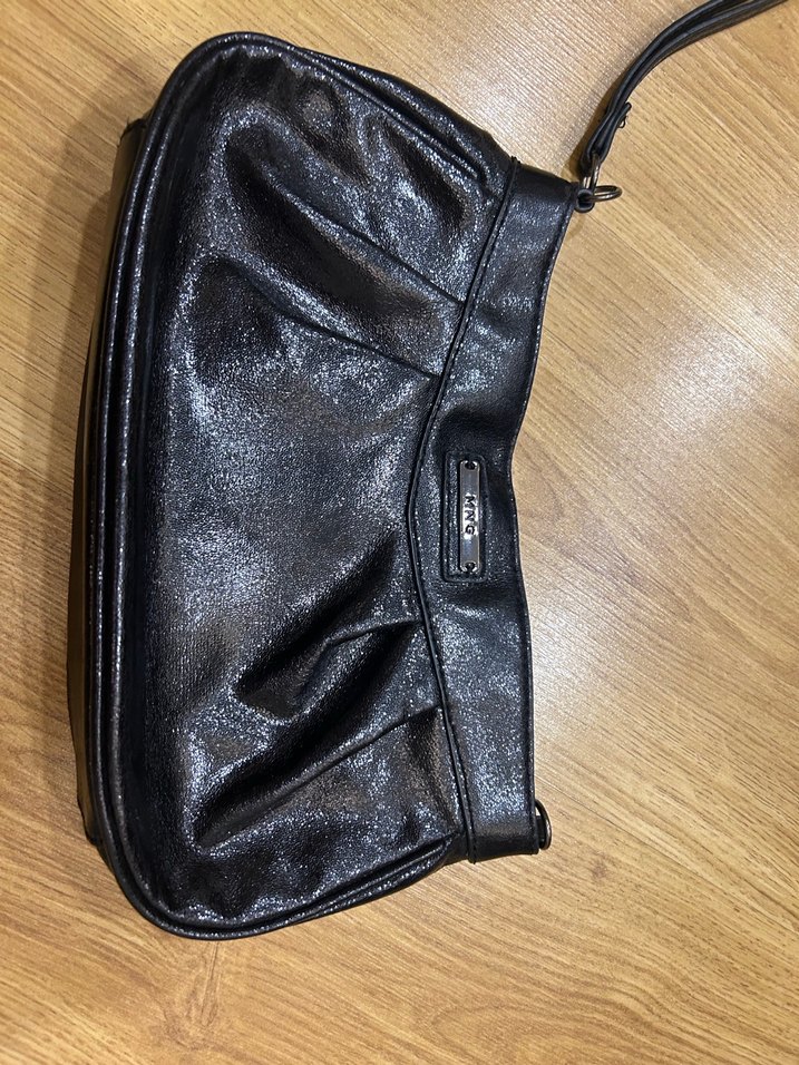 Parlak siyah deri kadın çantası, tokalı detaya sahip. Minimalist ve gotik tarzda, trend günlük kullanım için uygun, desensiz yüzeyli.