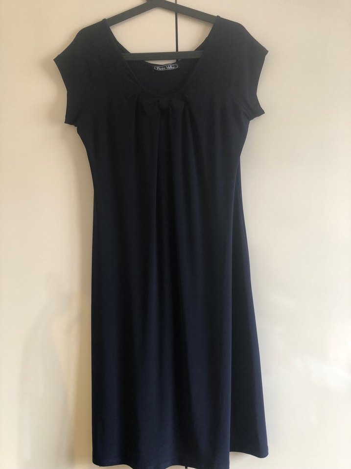 50*110 CM.Lacivert renkte, kısa kollu ve drapeli V yakalı midi elbisesi. Yumuşak kumaştan, ofis için uygun bol kesim.