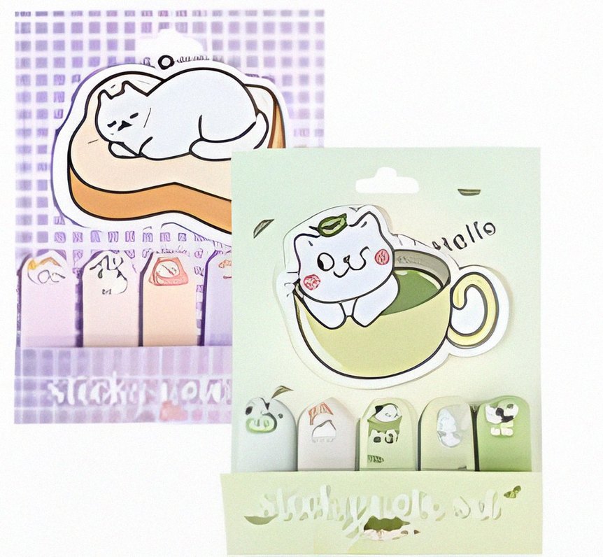 Yeşil pastel tonlarda, sevimli kedi figürlü postit Kedi severler için ideal.