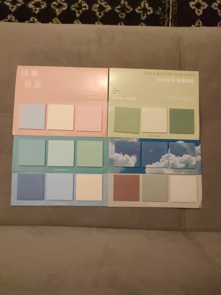 Pastel ve haki renklerde, bulut desenli ve çeşitli yapışkan not kağıtlarından oluşan planlayıcı seti.