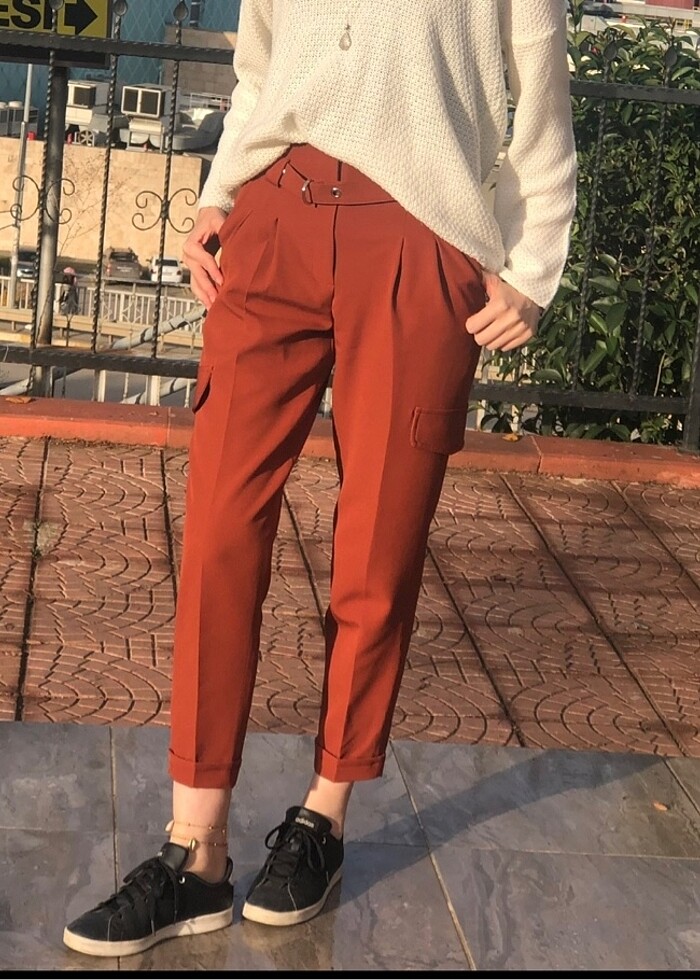 Gizli fermuar kemerli yanlarda cep vardır postacı pantolon tarçın renkli