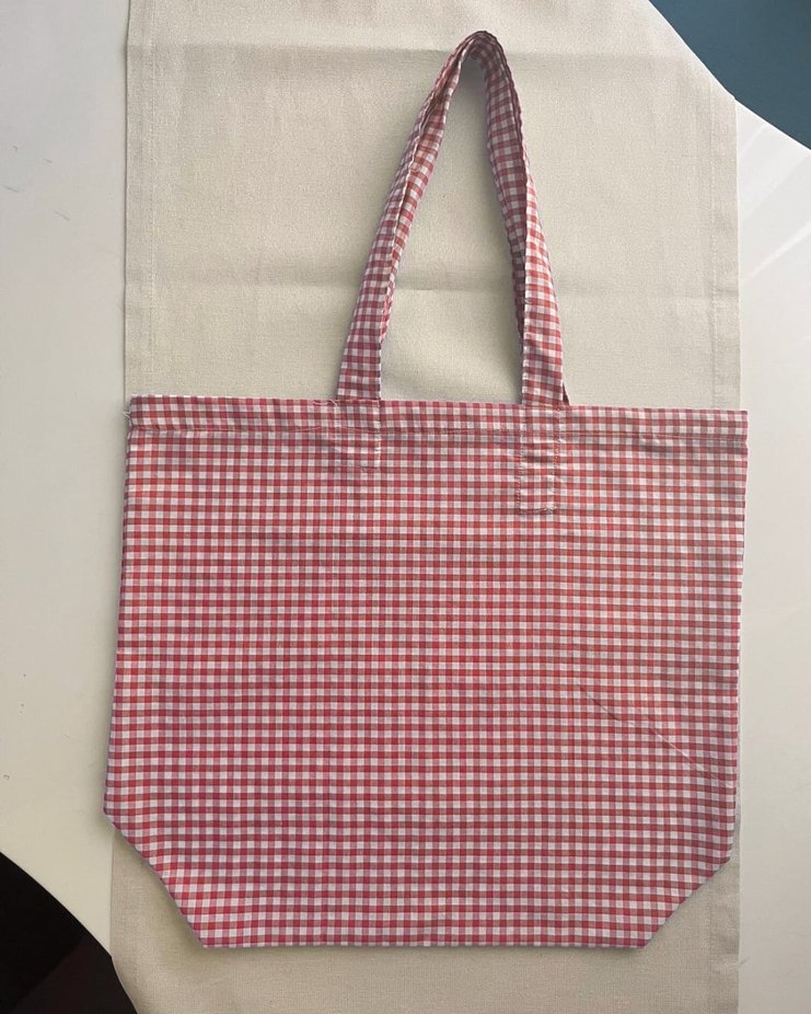 Kırmızı, yeşil, sarı ekose desenli kadın çanta, sentetik kumaştan yapılmış sade ve basic bir tasarıma sahiptir. El yapımı dikiş makinasıyla dikilmiştir.