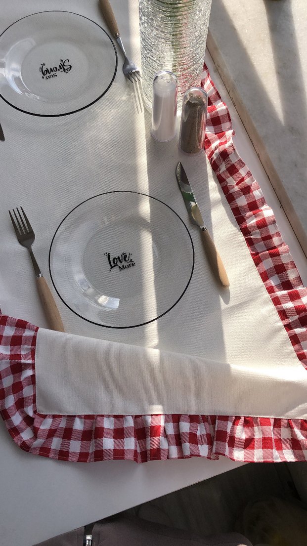 •Ürün malzemesi; Duck kumaştır . •1 Adet Runner •Fırfır ölçüsü 6 cm`dir •Leke, su tutmaz. •Dayanaklı sık dokulu kumaştır. •Kolay temizlenme özelliğine sahiptir. •Uzun ömürlü pamuklu kumaştır. •Renk atma yapmaz. •Temizlik: 30°C’de elde veya hassas programda yıkanabilir. Ekstra temizlik malzemesi kullanımı tavsiye edilmez.