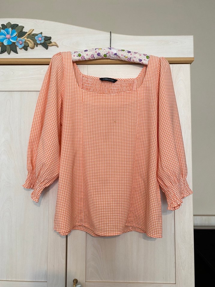 LCW marka, 40 beden pötikareli desenli turuncu renk bluz. Günlük kullanıma uygundur. Çok tatlı bir ürün, hiç kullanılmadı herhangi bir sorunu yoktur. Koltukaltı 48, omuzdan boy 58 cm. Arkası lastiklidir, esneme payı mevcut.