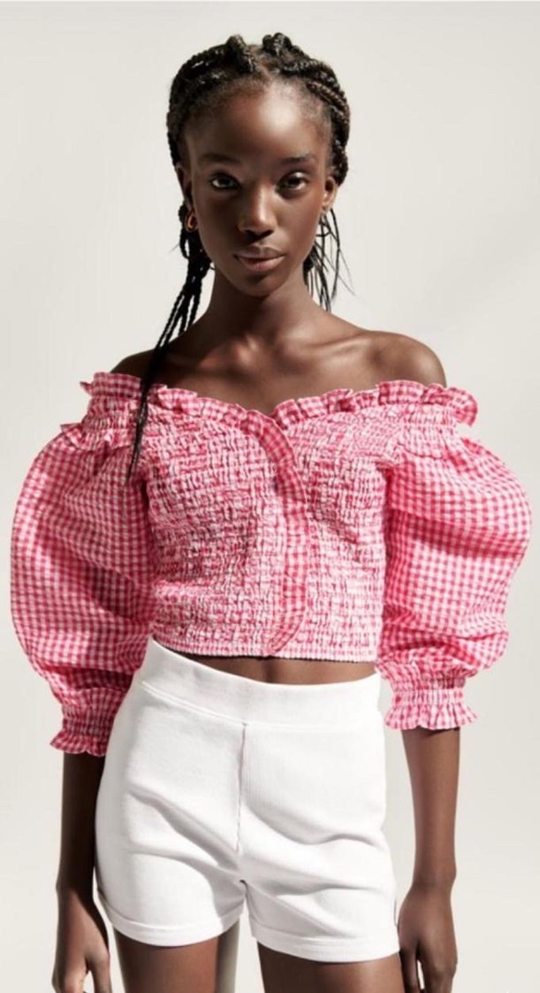 Pembe mini bluz, tekne yaka, düğme detaylı ve uzun balon kollu. Yumuşak pamuktan, bağlama desenli, sokak modasına uygun dar kesim.
