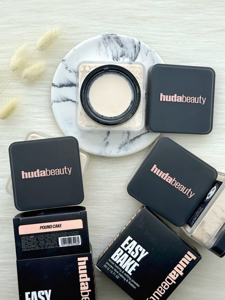 Bej ve gri tonlarında Easy Bake pudra, makyajda pürüzsüz bir bitiş sağlar. Ürün, marka logosu bulunan kompakt kutu ve ambalaj içerir.