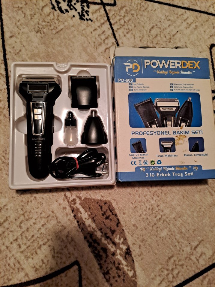 Powerdex profesyonel bakım seti, tıraş makinesi, burun temizleyici ve farklı başlıklarla 3'lü erkek tıraş seti siyah renkte. ✂️