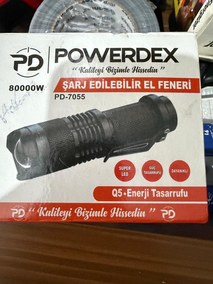 Powerdex PD-7055 şarj edilebilir siyah el feneri, süper LED, enerji tasarrufu ve dayanıklı yapıya sahiptir. 80000W güç sunar.