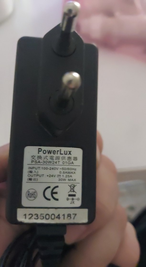PowerLux siyah telefon şarj adaptörü, 24V 1.25A çıkış gücü sağlar. 30W maksimum güç ve CE sertifikasına sahiptir. Model PSA-30W24T 01GA.