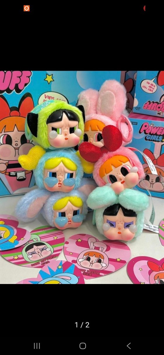 The Powerpuff Girls temalı, çeşitli sevimli hayvan figürlü renkli pastel peluş oyuncaklar.