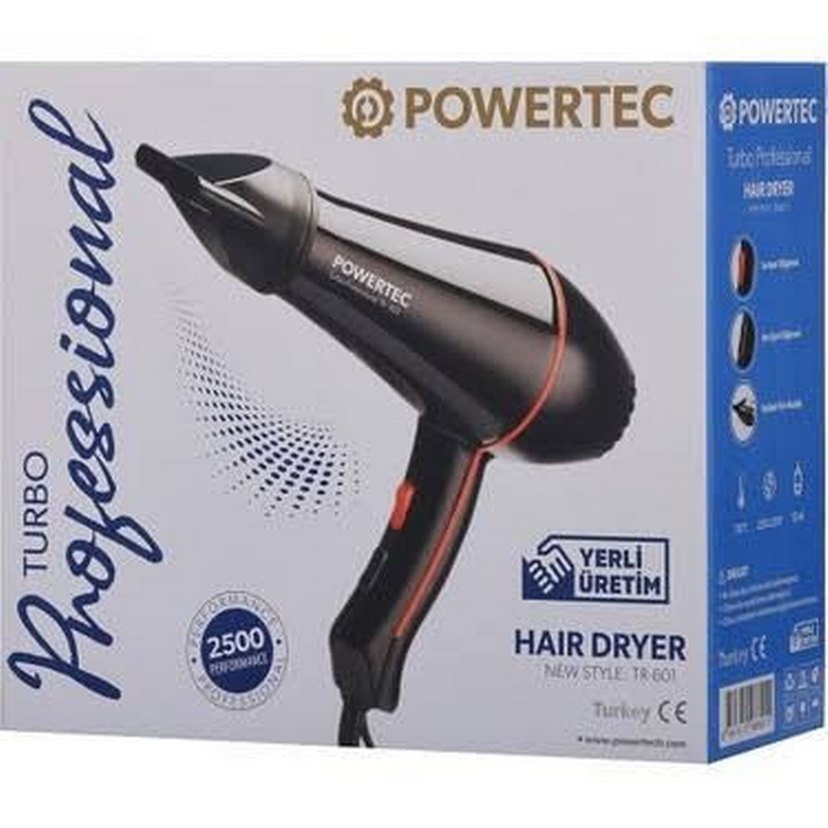 Powertec saç kurutma makinesi, 2500W güçlü siyah tasarıma sahiptir. Yerli üretim olup güvenilir kurutma performansı sunar. ️