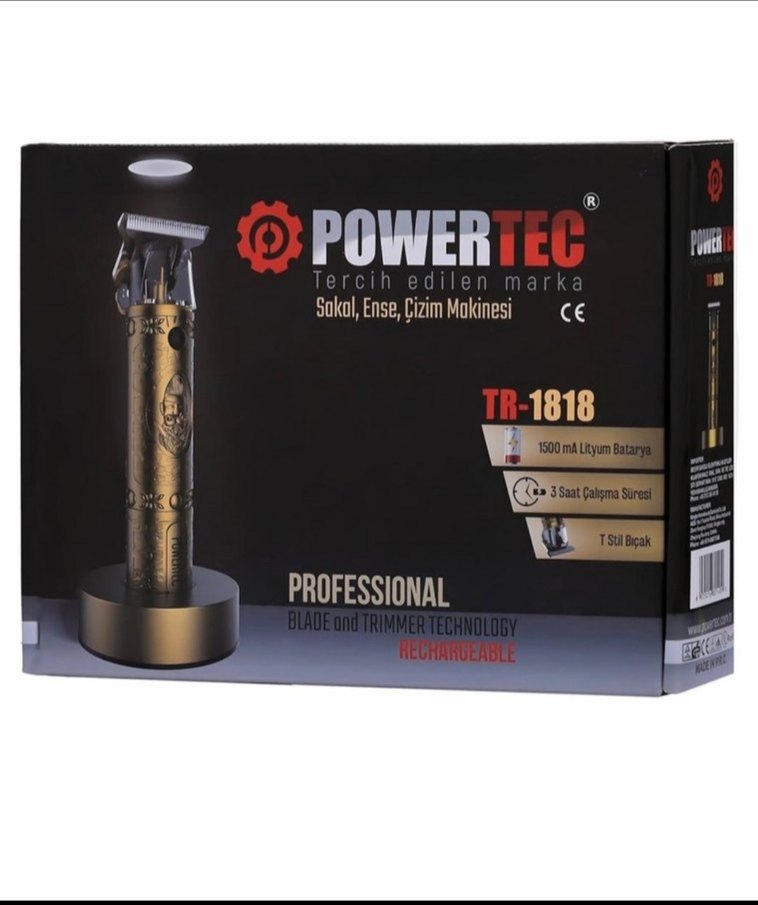 Powertec TR-1818 profesyonel şarjlı traş makinesi, 1500 mAh lityum batarya ile 3 saat kullanım sağlar. T çelik bıçak teknolojisine sahiptir. Sakal, ense ve çizim için uygundur.