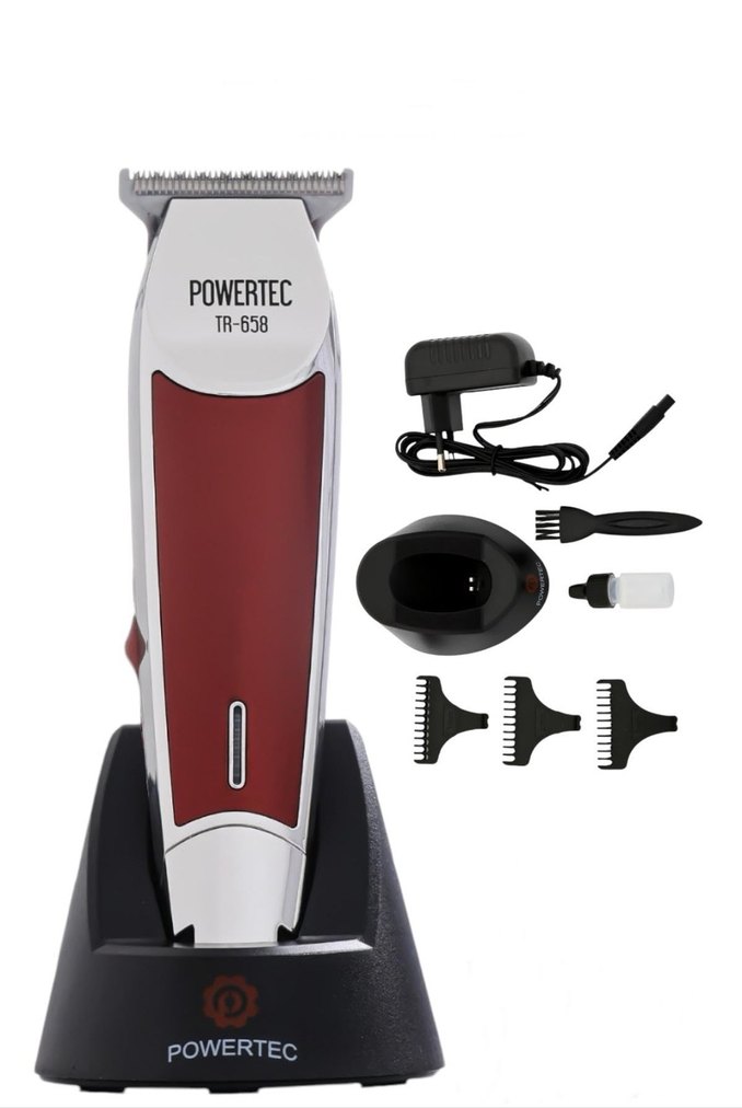 POWERTEC TR-658 koyu kırmızı tıraş makinesi, çeşitli tarak aparatlar, temizleme fırçası, yağ şişesi ve şarj standı ile birlikte gelir. ⚡