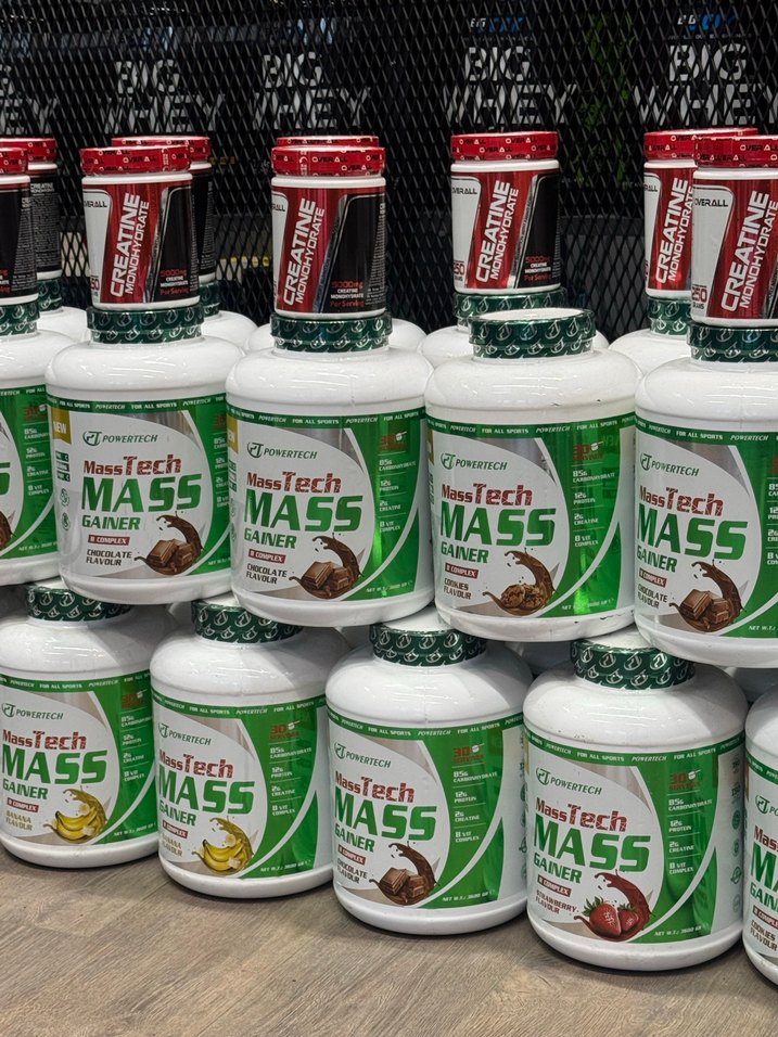 Powertech MassTech Mass Gainer toz, renkli yeşil kutularda ve kreatin takviyeleriyle birlikte sunulmaktadır. Sıfır Kapalı Kutudur Pazarlık payı vardır