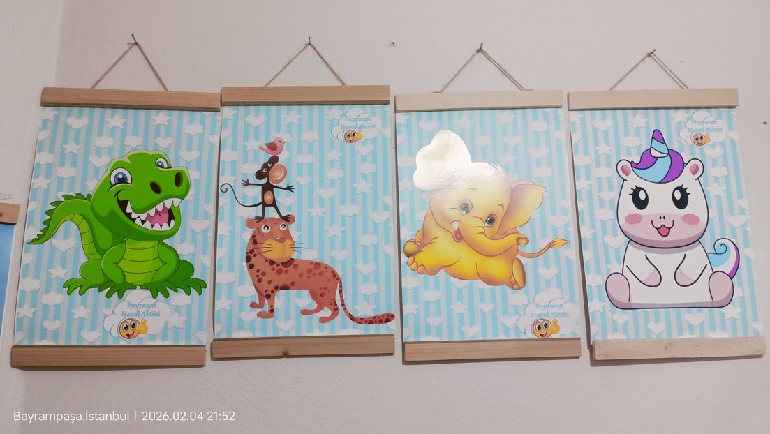 Pastel renklerde, fil, maymun ve leopar gibi hayvan figürleri içeren çocuk resimleri. Ahşap çerçeve ve asma ipiyle kullanıma hazır.