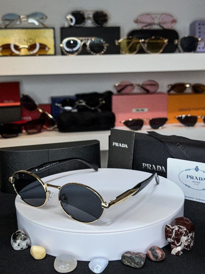 Parlak altın renkli çerçeve ve siyah camlı Prada güneş gözlüğü, klasik zarafet ve sokak stilini bir araya getirir. ️