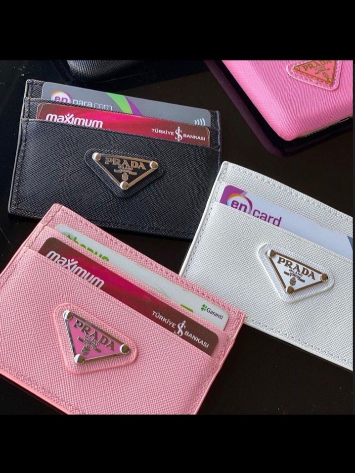 Prada baskılı deri cüzdan, pastel pembe renkte, velcro kapamalı, günlük kullanım için uygun, trend sokak stiliyle uyumlu.