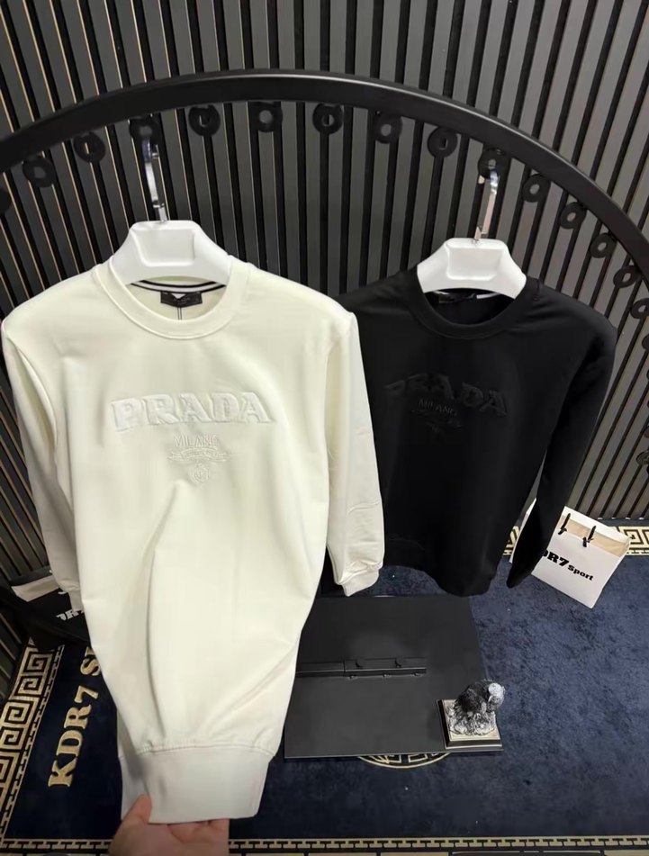 Pamuk kumaştan, uzun kollu, kısa kesim ve fitted kesime sahip beyaz erkek sweatshirt. Üzerinde "PRADA" baskısı bulunur. Günlük kullanım için rahat ve şık.