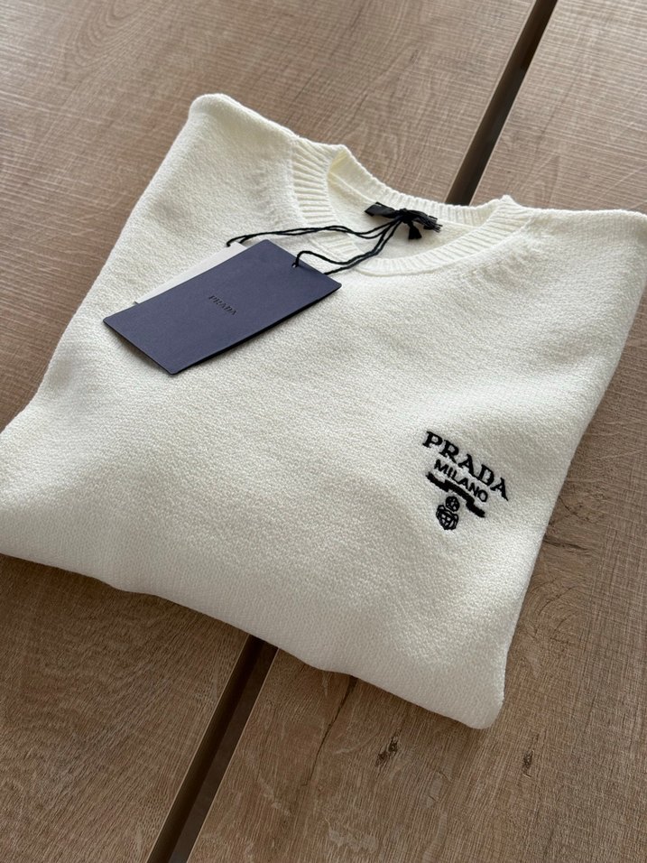Beyaz örgü sweatshirt, yuvarlak yaka ve uzun kolludur. Yumuşak ,normal kesim ve Prada Milano baskılıdır. Rahat sokak stili için uygundur.