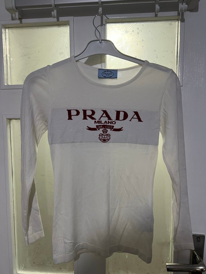 Pamuk kumaştan yapılmış, yuvarlak yakalı ve baskılı logolu, beyaz uzun kollu Prada kazağı Rahat ve şık bir görünüm sunar.