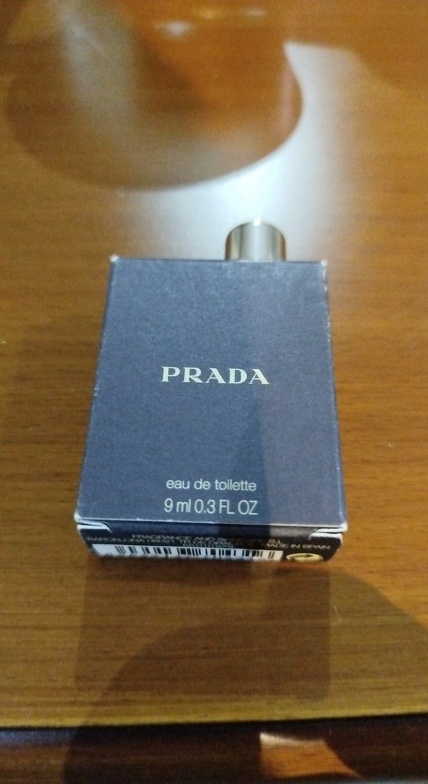 PRADA erkek parfümü, 9 ml, mavi kutuda. İş ve karşı kültür stillerine uygun. Ambalaj gri ve canlı mavi renktedir.