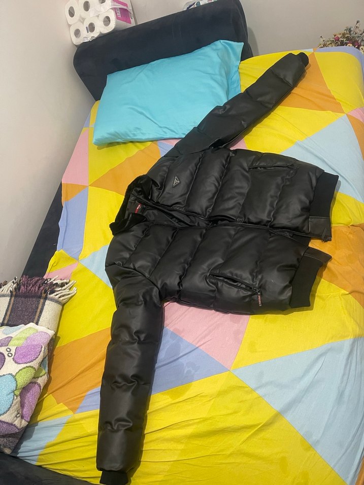 Fermuarlı, askılı kollu siyah erkek kışlık mont. Yumuşak sentetik kumaştan, midi boyda ve sokak stiline uygun, sıkı kesim