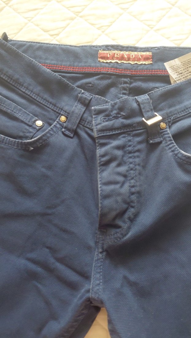 Prada markalı, parlak mavi renkte, kemer tokalı, dar kesim denim pantolon. Normal boy ve desen içermeyen sade tasarıma sahiptir.