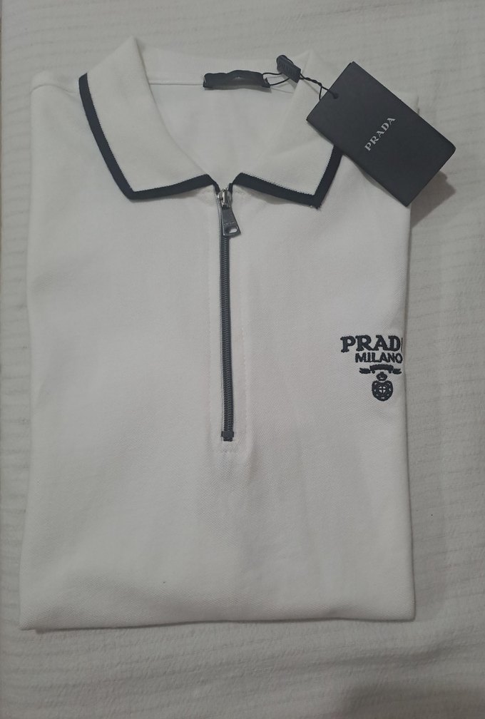 Beyaz, kısa kollu erkek polo tişört, fermuarlı-boyu 75 cm (omuzdan aşağı ölçüm) gögüs genişliği kol altı hizasından 55 cm #prada #Armani #Burberry #Lacoste #mavi #loft #lacivert #beyaz #fermuarlı