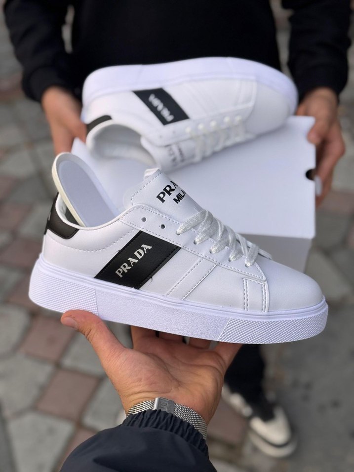 Beyaz, hafif desenli ve kauçuk tabanlı erkek sneakers. PRADA logosu bulunur, trend ve athleisure tarzlarına uygundur. lütfen renk ve numara bildirip sipariş açtırınız