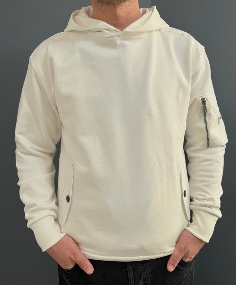 Erkek beyaz sweatshirt, yuvarlak yaka ve uzun kolludur. Regular fit, fermuarlı cepler ve kol detayına sahiptir. Yumuşak ve sıcak kumaştan üretilmiştir.