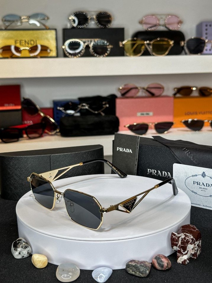 Prada'nın gold çerçeveli, gri camlı minimal tasarıma sahip kadın güneş gözlüğü, rahat ve şık bir görünüm sunar. ️