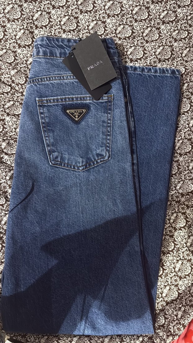 Prada markalı, mavi renkli, regular fit kesimde, fermuarlı detaylı kadın denim pantolon. Günlük sokak stili için uygun baskılı desene sahip midi boyda.