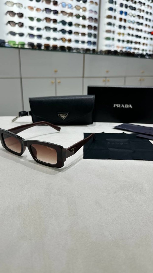 Parlak kahverengi çerçeveli Prada kadın güneş gözlüğü, klasik kare tasarımı ve şık görünümüyle dikkat çekiyor. Kılıf ve temizlik bezi ile birlikte.