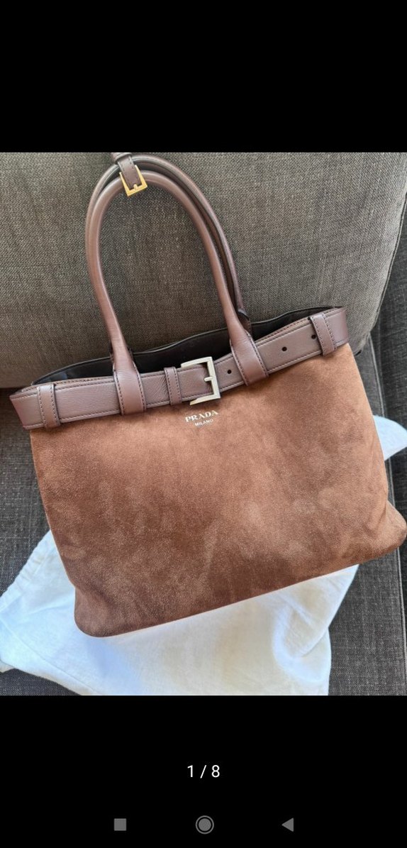 Prada markalı kahverengi süet gövde ve deri saplara sahip kemerli kadın çantası, çağdaş tarz ve Paris esintisi sunar. Günlük kullanım için uygundur.
