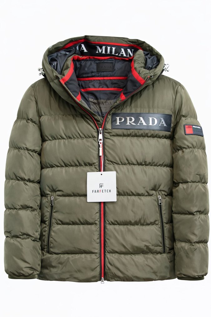 haki renkte, fermuarlı ön ve kapüşonlu erkek mont. Uzun kollu, regular fit ve baskılı detaylara sahip, günlük kullanıma uygun. Prada ve Farfetch marka logolu. TÜM BEDENLERİ MEVCUTTUR