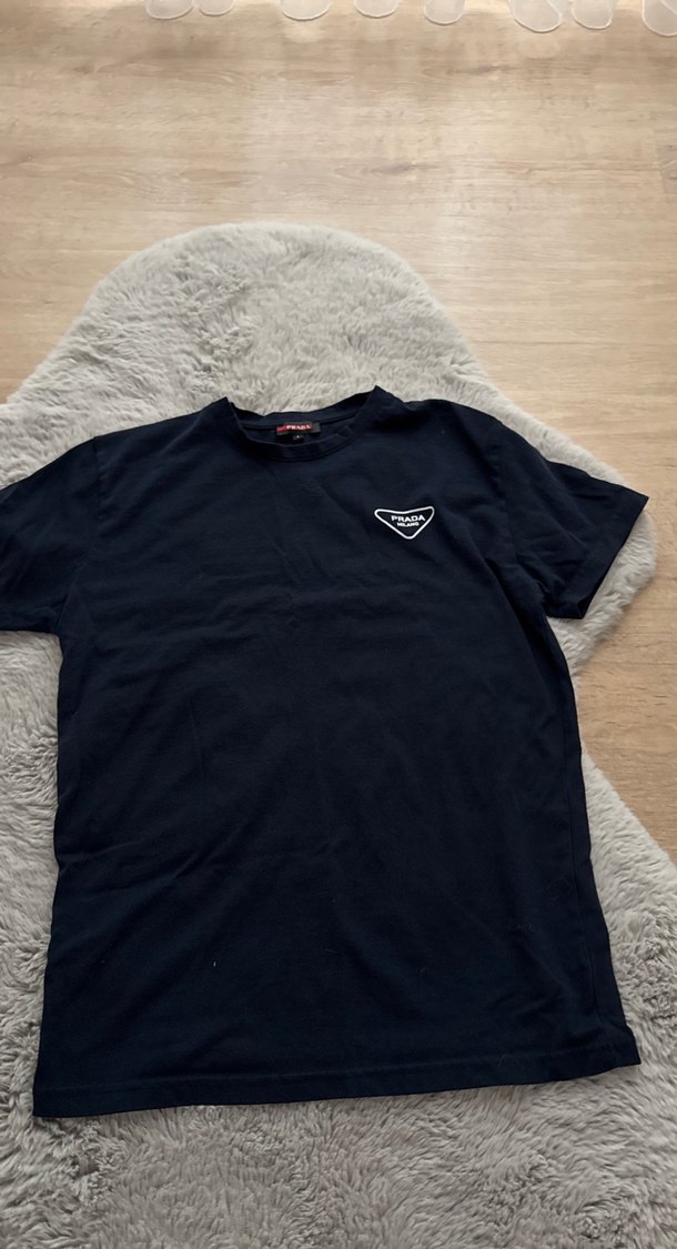 Lacivert pamuklu, kısa kollu, bisiklet yaka ve fitted kesime sahip Prada tişört, küçük logo baskılıdır. Trendy gündelik stil için uygundur. Hiç giyilmedi