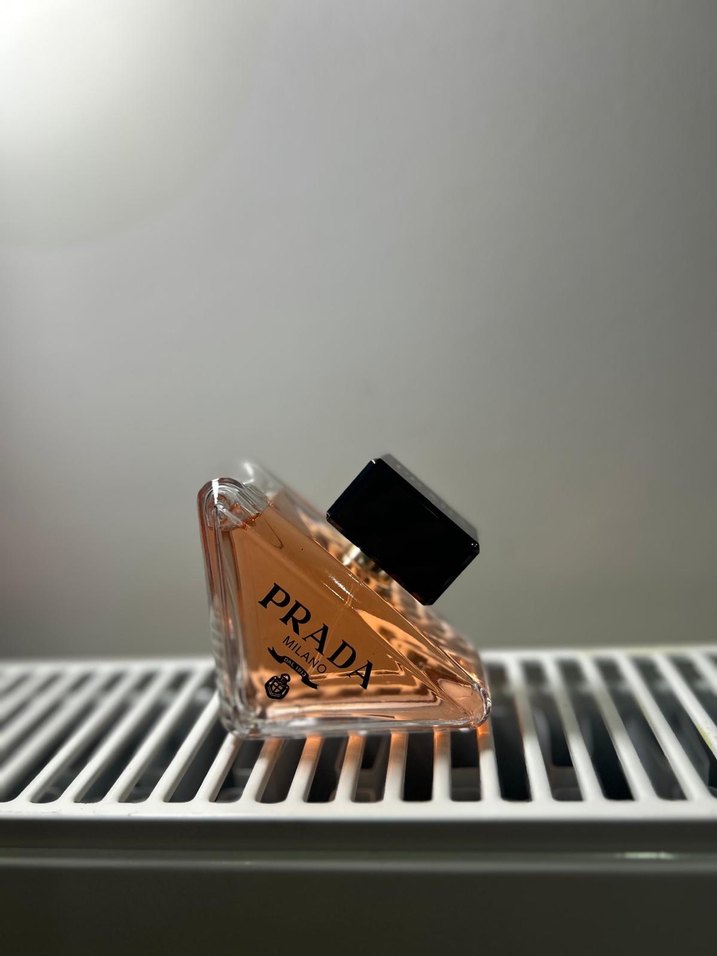 Prada Milano kadın parfümü, benzersiz üçgen şişe tasarımı ve yumuşak, zarif kokusuyla. Şeftali renkli sıvı ve siyah kapak içerir.