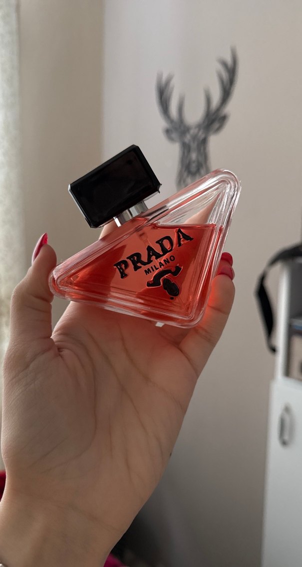 Prada Milano kadın parfümü, siyah kapaklı üçgen cam şişede, pembe renkte kokuyla orjinal değildir ama kalıcı bir parfümdür