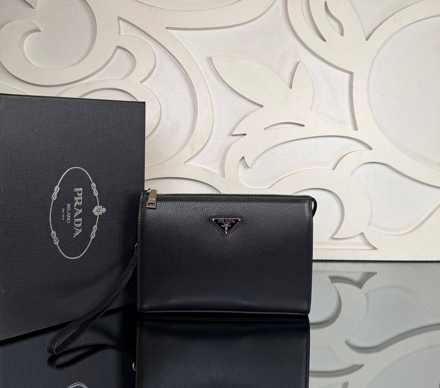Bu erkek cüzdanı, baskılı deseni ve modern klasik tarzıyla koyu siyah renktedir. İş ortamı için klasik şıklığı ve pratikliği bir araya getirir. Prada Leather Pouch İthal Ürün A+ Plus 26x18 cm 910480