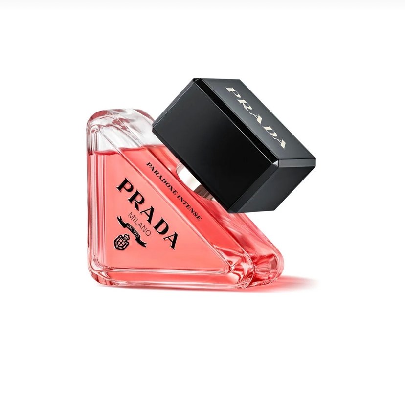 Prada Paradoxe Intense kadın parfümü, siyah kapaklı üçgen cam şişede yoğun ve zengin bir koku sunar.