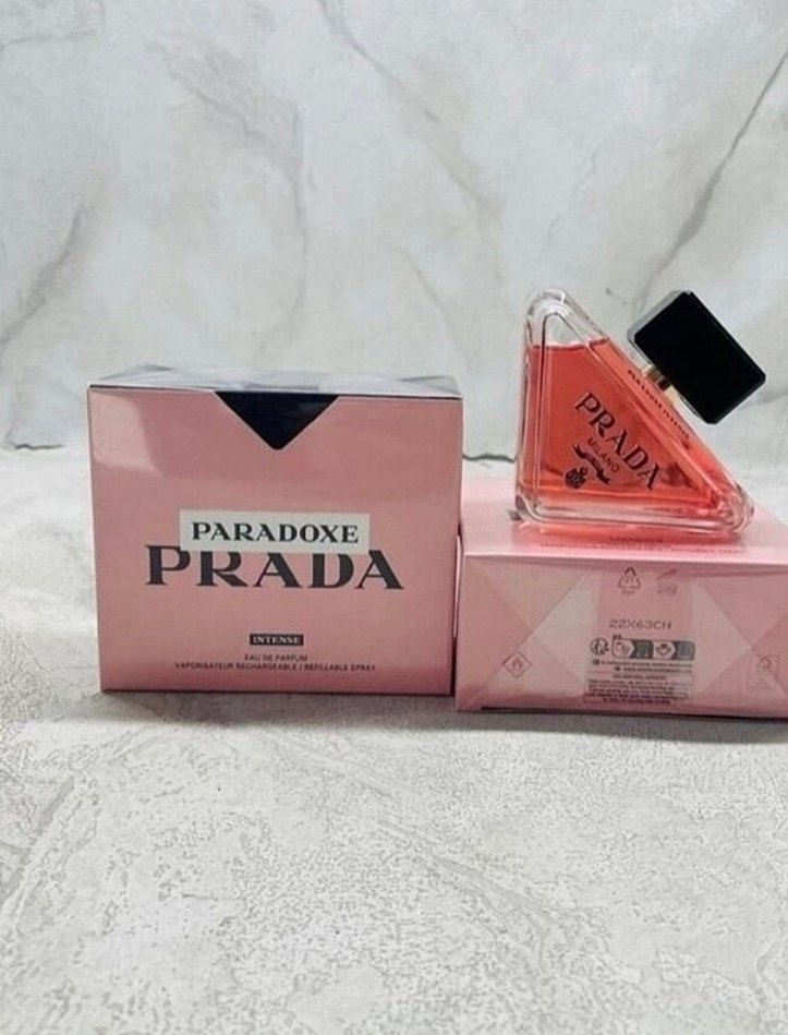 Prada Paradoxe, üçgen şişesi ve yumuşak pembe tonu ile kadın parfümü. Yoğun koku deneyimi sunar.