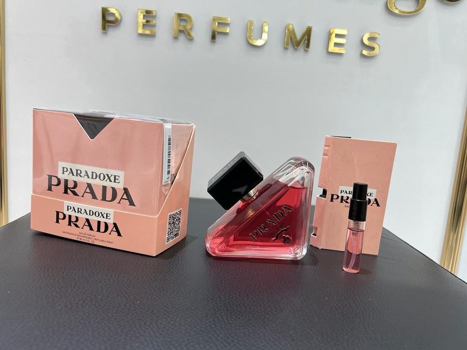 Prada markalı kadın parfümü, pembe renkte sıvı içeren üçgen mini şişede sunuluyor. Modern ve dikkat çekici tasarıma sahip.
