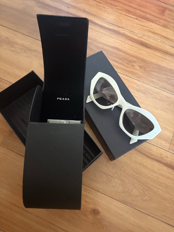 Parlak beyaz renkte, çağdaş tasarıma sahip Prada kadın güneş gözlüğü. Moda ve avangart tarz için uygun. Siyah koruyucu kılıf ile birlikte.