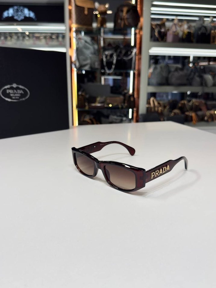 Parlak kahverengi çerçeveli Prada kadın güneş gözlüğü, trend sokak modasına uygun dikdörtgen camlarla Paris tarzını yansıtıyor. ️