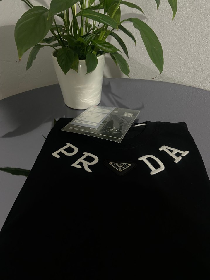 Prada marka siyah baskılı erkek tişört, kısa kollu ve yuvarlak yakalıdır. Rahat kesimi ve baskılı deseniyle sokak modasına uygundur. 'PR' harfleri baskıdadır.