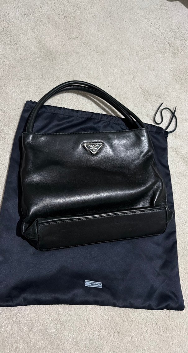 Prada markalı siyah deri kadın çantası, minimal tasarım ve fermuarlı kapanış ile günlük sokak stili için uygundur. Şıklık ve işlevselliği bir arada sunar.