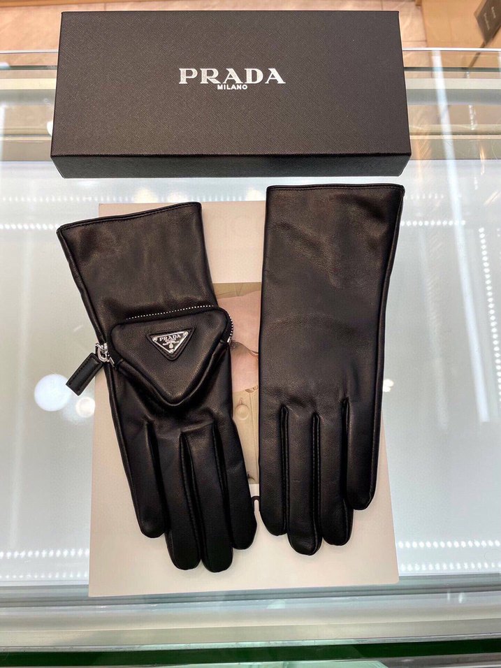 Prada imzalı siyah deri kadın eldivenler, fermuarlı cep ve biker tarzıyla öne çıkar, şık ve yenilikçi bir görünüm sunar.