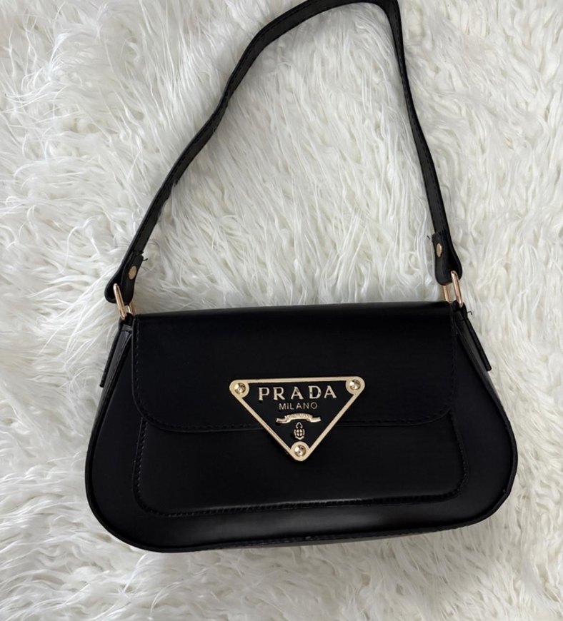 Siyah deri, tokalı askılı ve baskılı logolu günlük kullanıma uygun Prada Milano marka kadın omuz çantası. Şık ve koyu renk tasarım.
