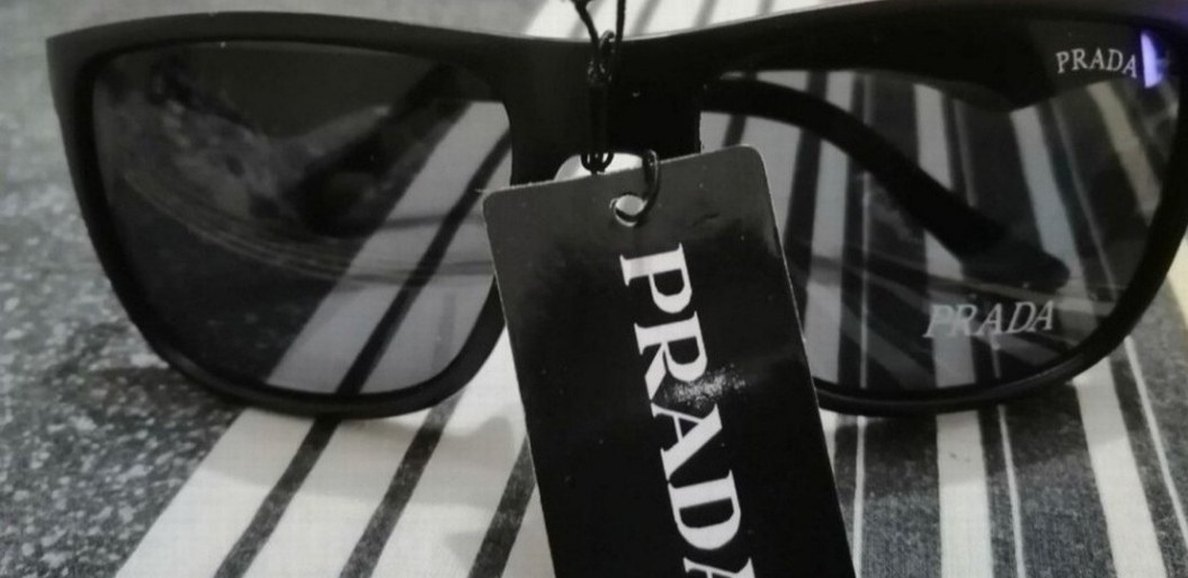 PRADA logosu taşıyan siyah erkek güneş gözlüğü sokak giyimi ve grunge punk tarzında şık bir görünüm sunar.