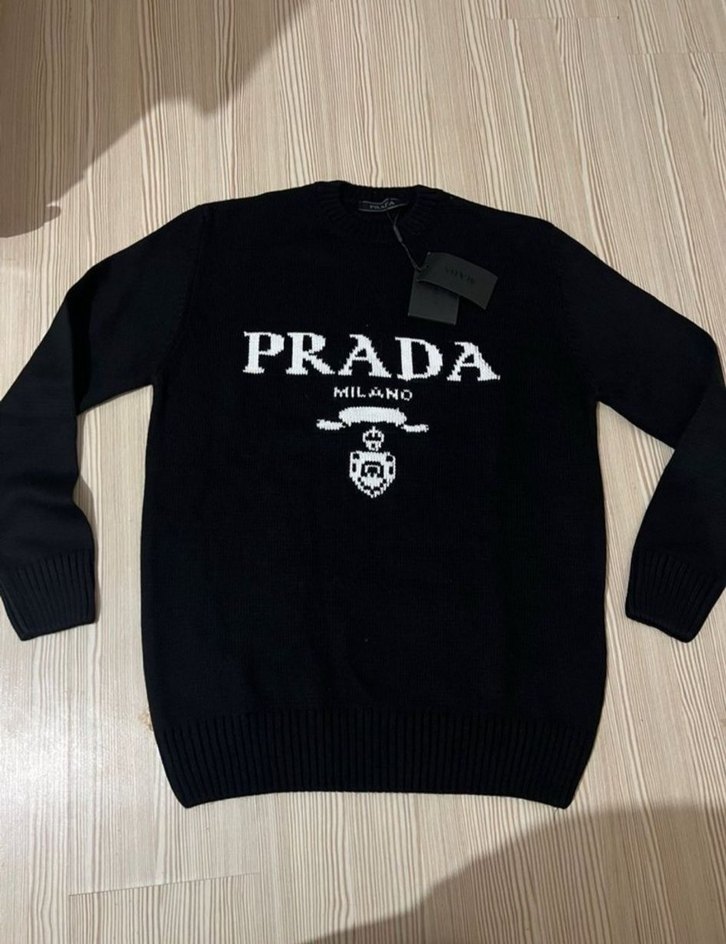 Prada marka siyah örme, baskılı logolu, uzun kollu, normal boy, bol kesim erkek sweatshirt.